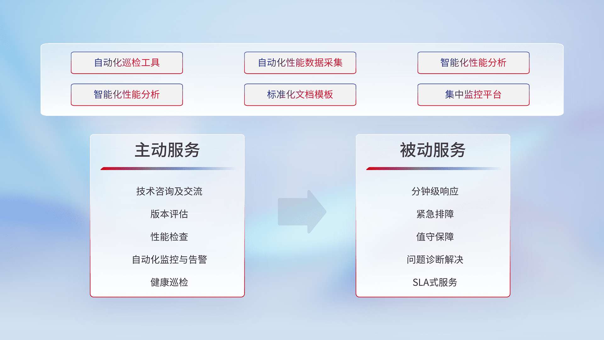 智能化工具和标准化文档,,,保障服务质量,,,提供主动服务(包含技术咨询、、版本评估、、、性能检查、、、、自动化监控与告警、、健康巡检)和被动服务包含(分钟级响应、、、紧急排障、、、值守保障、、问题诊断解决、、SLA服务)。。。
